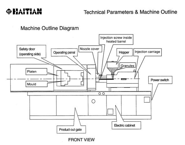 Injection moulding is simply granular plastic gravity fed from a holding tank, called a hopper, into a heated barrel. The granules are turned into a molten form and pushed through a nozzle, which rests against the mould.